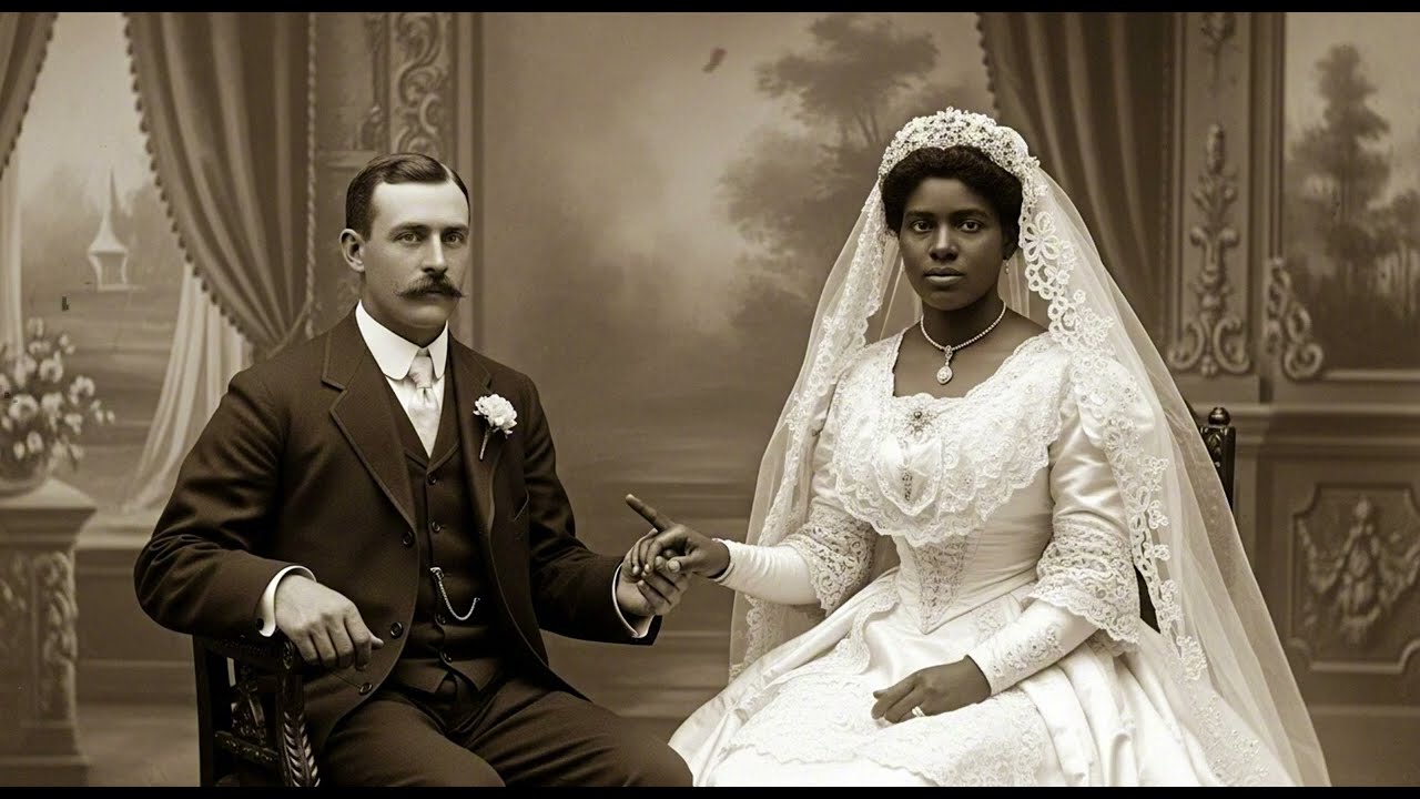 The image was striking immediately: a white man in a dark three-piece suit sat stiffly in a studio chair. Beside him stood a Black woman in a heavy white wedding gown, her gloved hand resting atop his. The backdrop—painted columns and soft drapery—suggested the Morrison & Wright Portrait Studio, a well-known Atlanta business at the turn of the century.