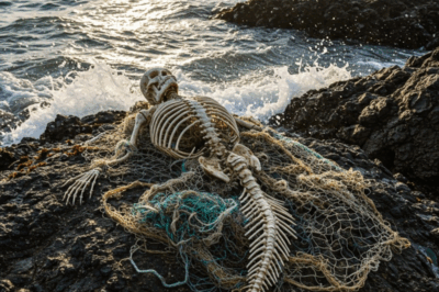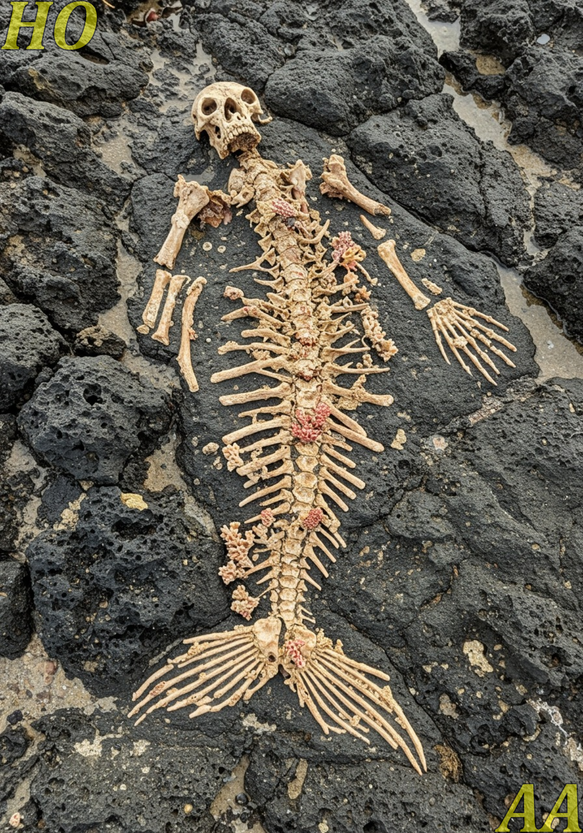 In the shadow of volcanic voids, where the ocean’s fury meets the world’s forgotten edges, a haunting spectacle has surfaced: the skeletal remains of a mermaid, twisted in ebony boulders and tangled in tidal tears. This isn’t the shimmering fantasy of childhood tales—this is a grotesque guardian, a chilling hybrid of human bone and coral crown, finned and fragile, staring out from the shallows with silent accusation.